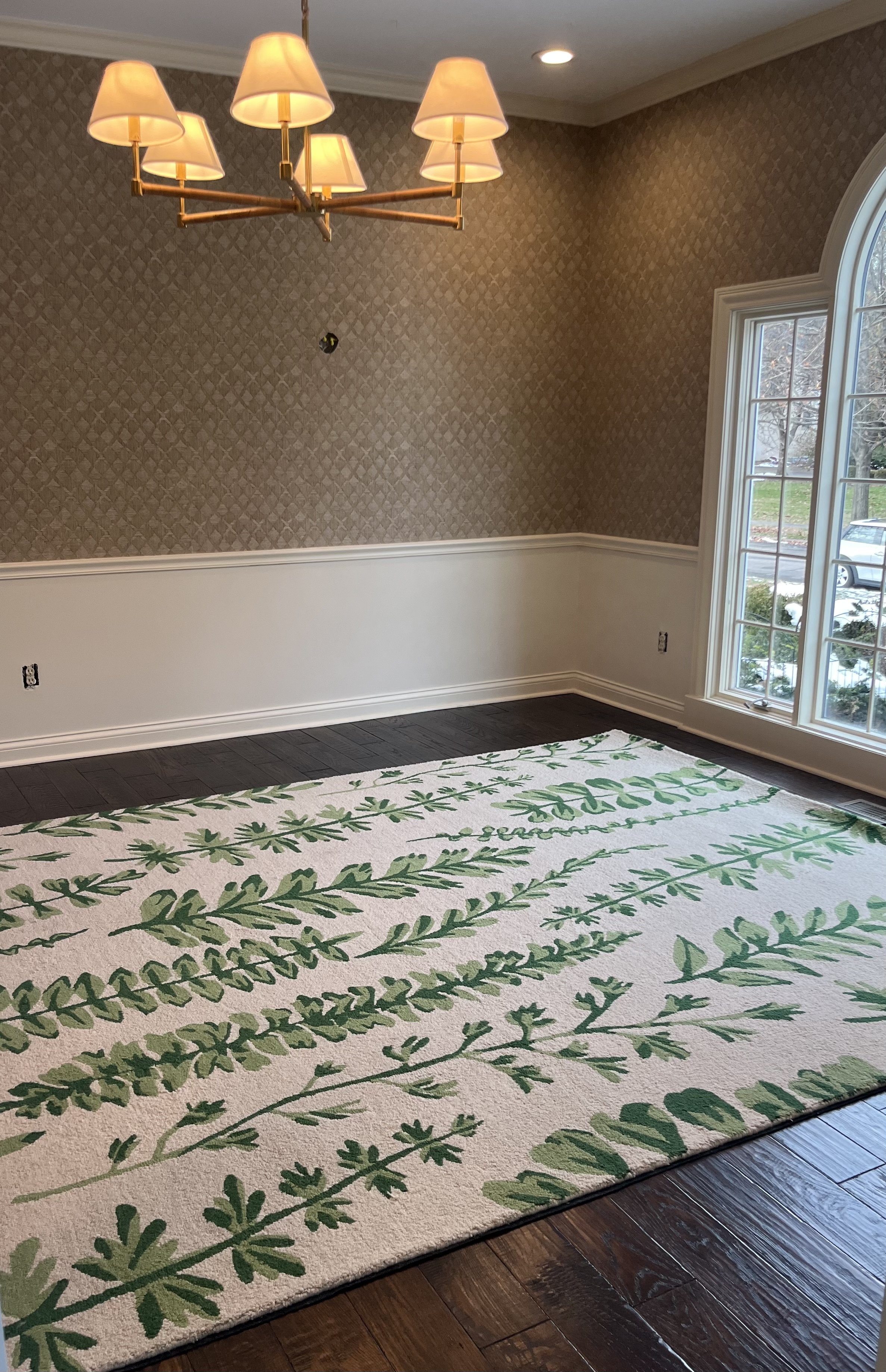 A dated, beige dining room with textured walls became one of the most talked-about rooms in the house. Texture diamond wallpaper, custom aged white chair rail, a botanical rug, bespoke curtains, and and a statement console beneath the original arched window- every layer was chosen to complement the next.