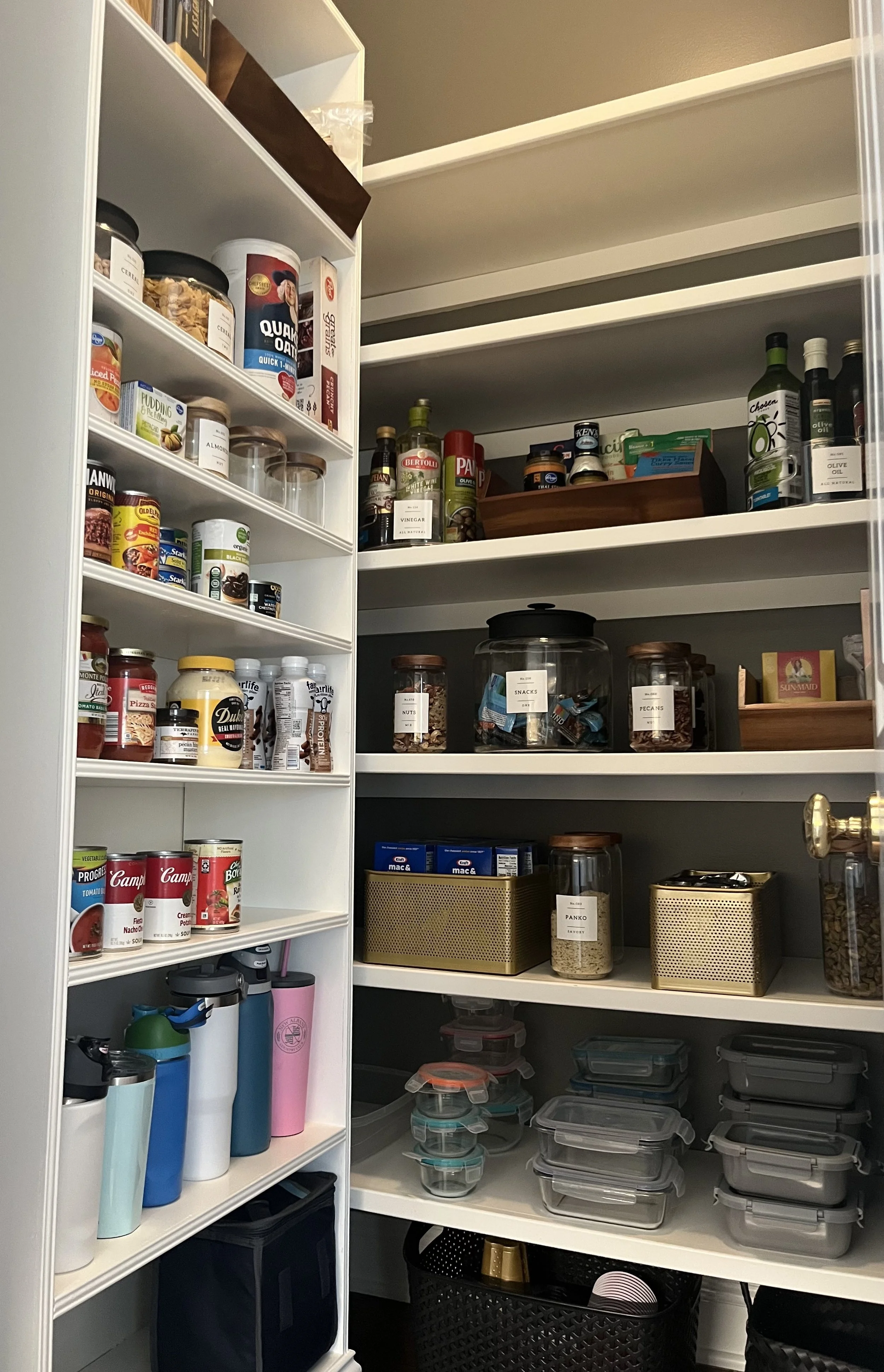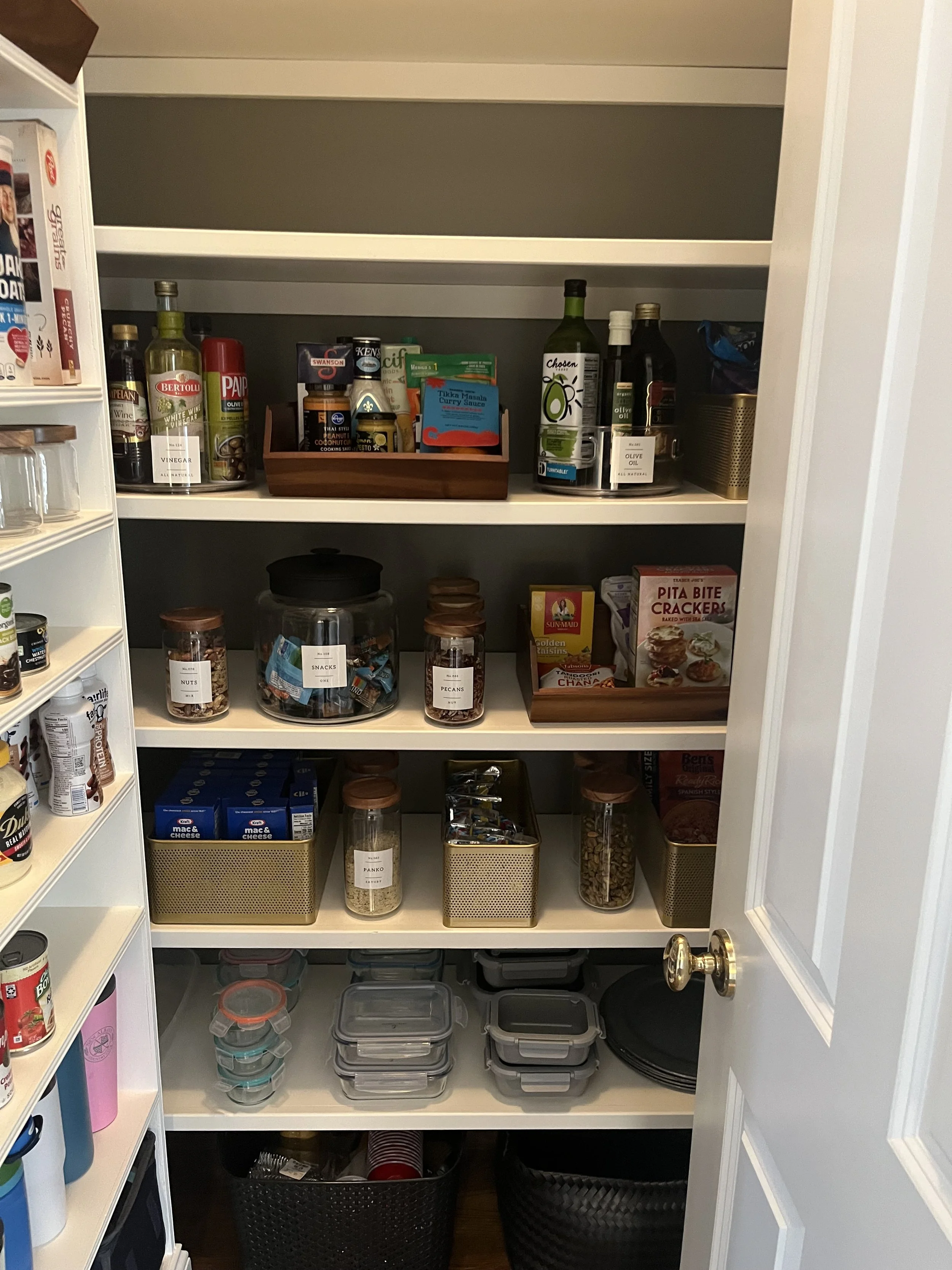 A rich Chelsea Gray paint was added to the walls, and crisp Simply White from Benjamin Moore, went on the custom shelving. A thoughtfully curated organization system changed everything. Glass jars, gold mesh containers, and dark acacia wood containers, and a custom labeling system turned a purely functional space into one the whole family actually enjoys opening.